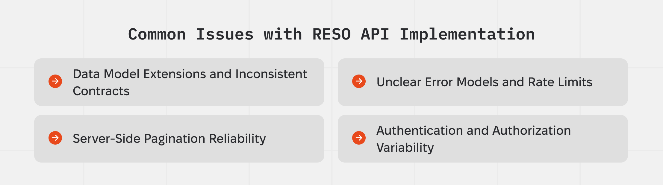 That gap between the standard and real-world use shows up in the same places again and again. Let’s look at the four issues that keep RESO APIs from delivering on their full promise.