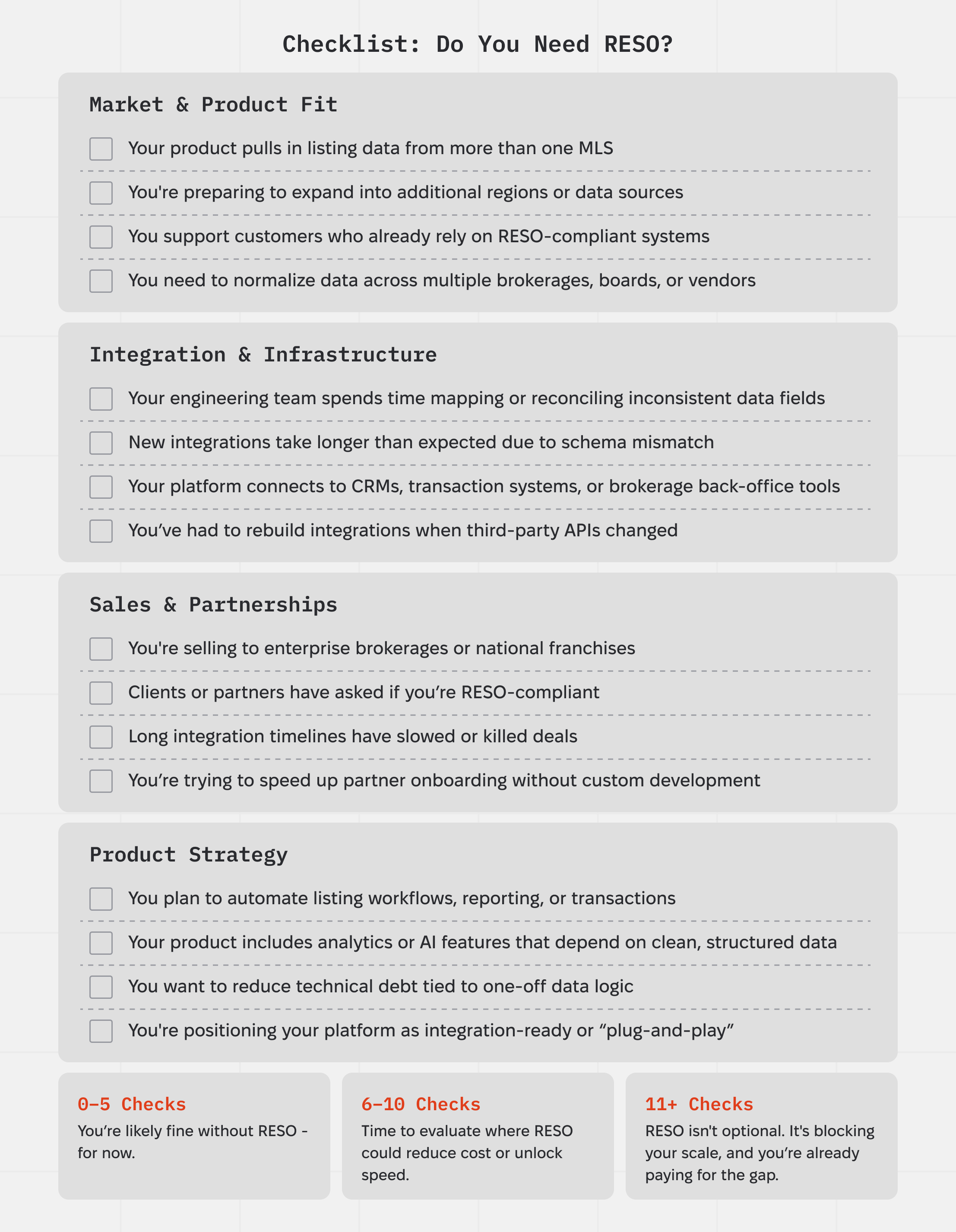 This checklist isn’t about technical readiness – it’s about business alignment. If you check enough of these boxes, RESO likely belongs in your near-term strategy.