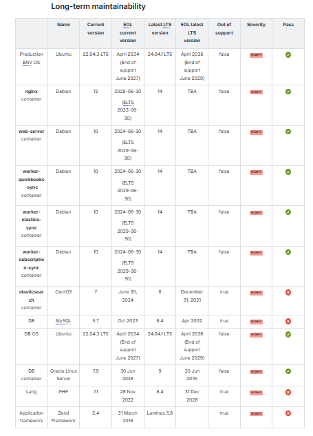 At risk: CentOS 7 (EOL since 2020), MySQL 5.7 (EOL 2023) — both now compliance liabilities.